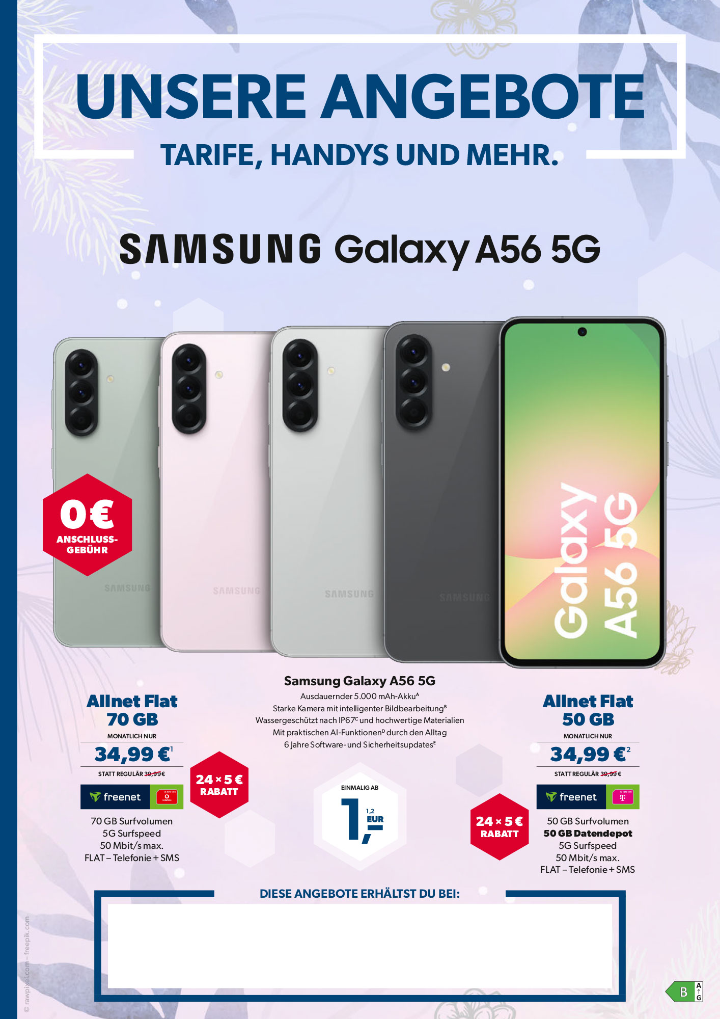Zur Verfügung stehen drei Angebots-Flyer und eine Auswahl von monatlichen Tarif-, Hardware- und Image-Plakaten mit den Produkten von freenet und klarmobil. Die Partner können frei wählen, wann welches Angebot den größten Mehrwert bringt.